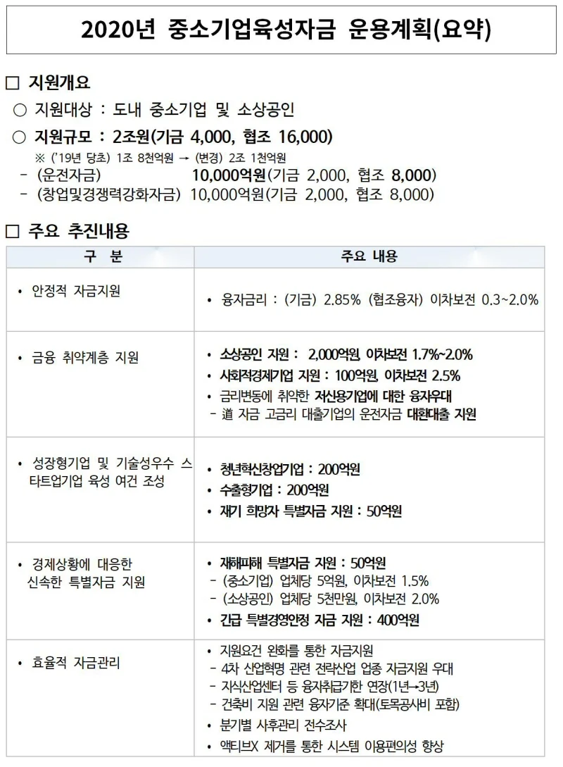 ‘2020년도 중소기업 육성자금’ 지원규모는 경영안정을 위한 운전자금 1조 원, 창업 및 경쟁력강화를 위한 자금 1조 원 등 총 2조 원이다. 기금대출 금리는 2.85%, 이차보전은 0.3~2.0%다.
