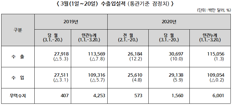 2020년 3월 1일 ~ 3월 20일 수출 307억 달러, 수입 291억 달러로 전년 동기 대비 수출 10.0%(27.8억 달러↑) 증가, 수입 5.9%(16.3억 달러↑) 증가