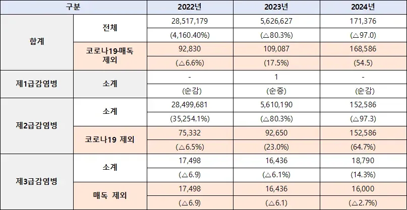 ▲ 2022~2024년 법정감염병 발생 현황. 2024년은 코로나19 제외 시 전년 대비 54.5% 급증.